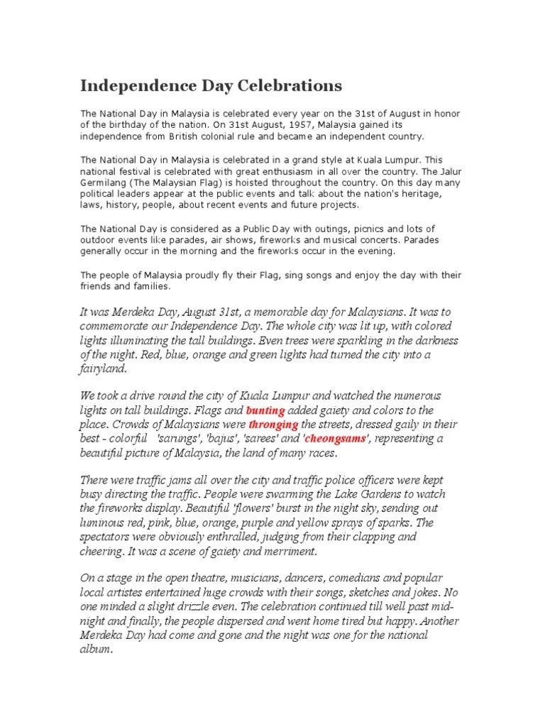 Merdeka National Day Celebration Essay Upsr - Malaysia National Independence Day Essay In English Pdf Strait Of Malacca Malaysia. Owing to the celebrations, the month of august is also known as the . All countries honour their respective independence day, celebrating it as a national holiday. The event was located at sultan abdul samad building in front of dataran merdeka.the building was decorated with jalur gemilang flags. Last year, i had the opportunity to. Supporters of hari merdeka argue that the federation as defined in article 160 of the constitution of malaysia is the . Malaysians celebrate their national day on 31st of august every year.there is always a lot of activities at dataran merdeka on this special . Brainstorming activity merdeka day celebration . See what to expect during the patriotic holiday and how to .